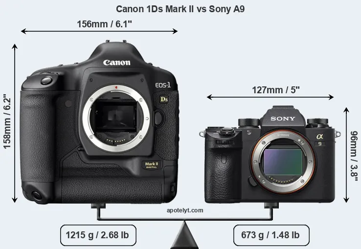 The physical size and weight of the Canon 1Ds Mark II and the Sony A9 are illustrated in the side-by-side display below. The two cameras are presented according to their relative size. Three successive views from the front, the top, and the rear are shown. All width, height and depth dimensions are rounded to the nearest millimeter.