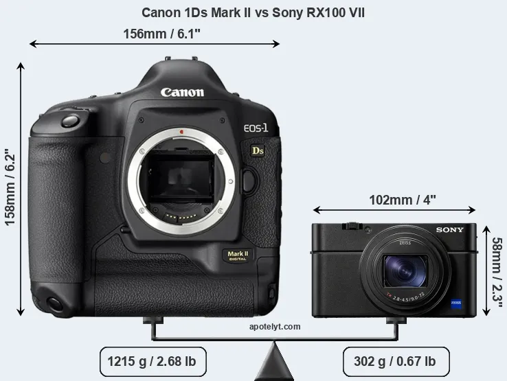 An illustration of the physical size and weight of the Canon 1Ds Mark II and the Sony RX100 VII is provided in the side-by-side display below. The two cameras are presented according to their relative size. Three successive views from the front, the top, and the rear are shown. All width, height and depth measures are rounded to the nearest millimeter.