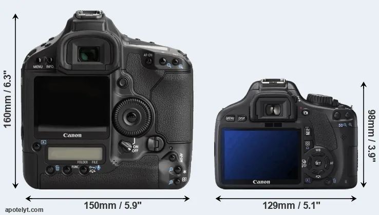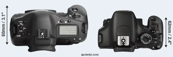 The side-by-side display below illustrates the physical size and weight of the Canon 1Ds Mark III and the Canon 550D. The two cameras are presented according to their relative size. Three consecutive perspectives from the front, the top, and the back are available. All width, height and depth measures are rounded to the nearest millimeter.