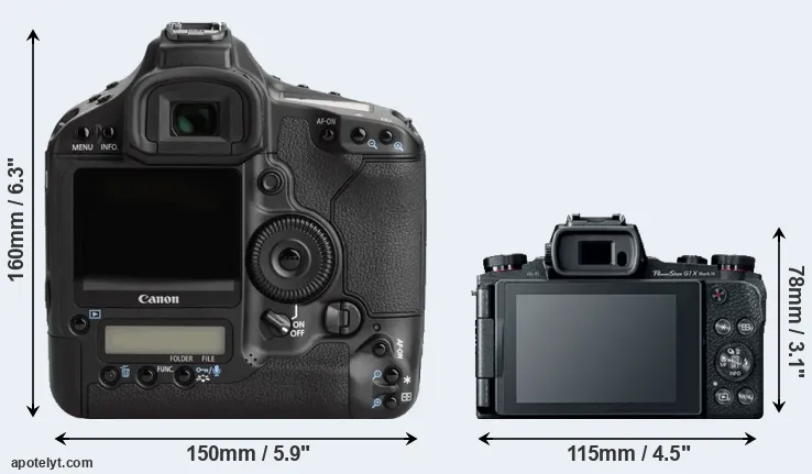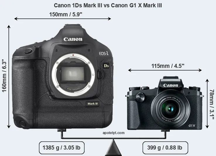 An illustration of the physical size and weight of the Canon 1Ds Mark III and the Canon G1 X Mark III is provided in the side-by-side display below. The two cameras are presented according to their relative size. Three consecutive perspectives from the front, the top, and the back are available. All size dimensions are rounded to the nearest millimeter.