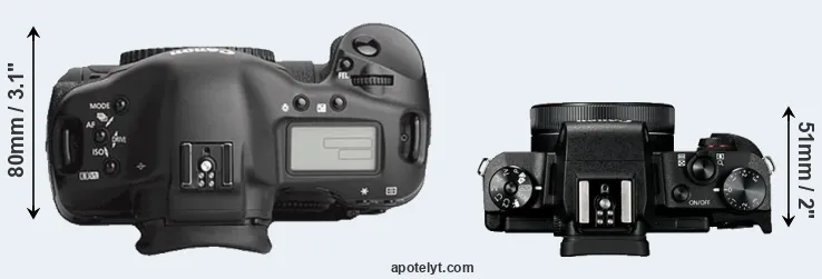 The above size and weight comparisons are to some extent incomplete and possibly misleading, as the G1X Mark III has a lens built in, whereas the 1Ds Mark III is an interchangeable lens camera that requires a separate lens. Attaching the latter will add extra weight and bulk to the setup. You can compare the optics available for the 1Ds Mark III and their specifications in the Canon EF Lens Catalog.
