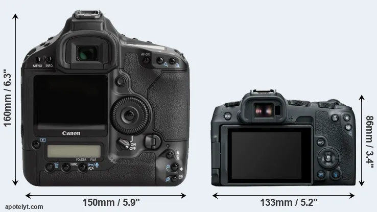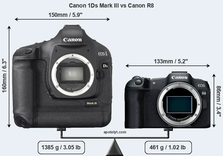 An illustration of the physical size and weight of the Canon 1Ds Mark III and the Canon R8 is provided in the side-by-side display below. The two cameras are presented according to their relative size. Three successive views from the front, the top, and the rear are shown. All size dimensions are rounded to the nearest millimeter.
