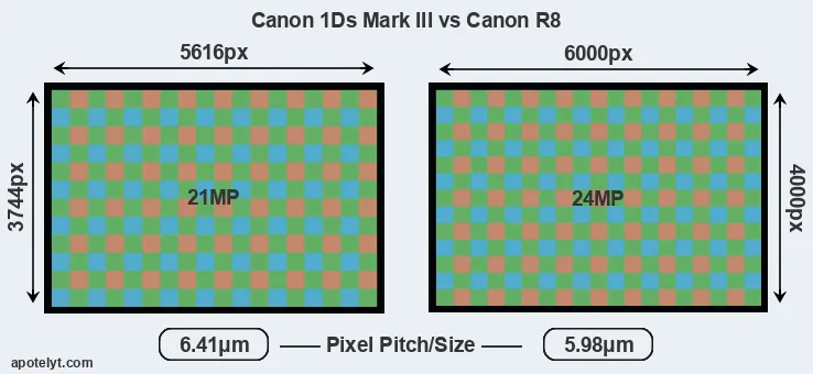 Despite having a slightly smaller sensor, the R8 offers a higher resolution of 24 megapixels, compared with 21 MP of the 1Ds Mark III. This megapixels advantage comes at the cost of a higher pixel density and a smaller size of the individual pixel (with a pixel pitch of 5.98μm versus 6.41μm for the 1Ds Mark III). However, it should be noted that the R8 is much more recent (by 15 years and 5 months) than the 1Ds Mark III, and its sensor will have benefitted from technological advances during this time that make it possible to gather light more efficiently.