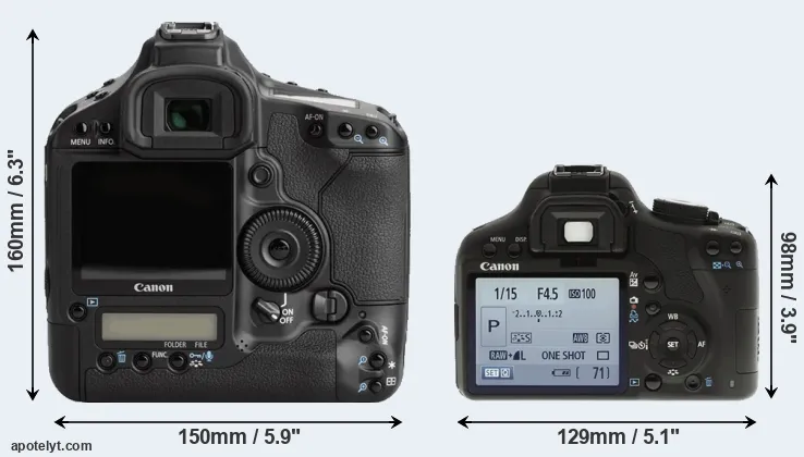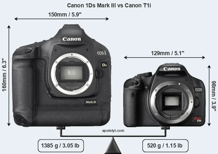 The side-by-side display below illustrates the physical size and weight of the Canon 1Ds Mark III and the Canon T1i. The two cameras are presented according to their relative size. Three successive views from the front, the top, and the rear are shown. All size dimensions are rounded to the nearest millimeter.