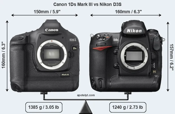 An illustration of the physical size and weight of the Canon 1Ds Mark III and the Nikon D3S is provided in the side-by-side display below. The two cameras are presented according to their relative size. Three consecutive perspectives from the front, the top, and the back are available. All width, height and depth dimensions are rounded to the nearest millimeter.