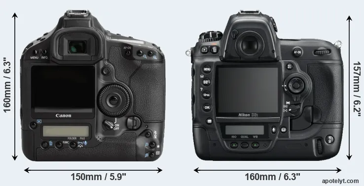 If the front view area (width x height) of the cameras is taken as an aggregate measure of their size, the Nikon D3S is somewhat larger (5 percent) than the Canon 1Ds Mark III. However, the D3S is markedly lighter (10 percent) than the 1Ds Mark III. In this context, it is worth noting that both cameras are splash and dust-proof and can, hence, be used in inclement weather conditions or harsh environments.
