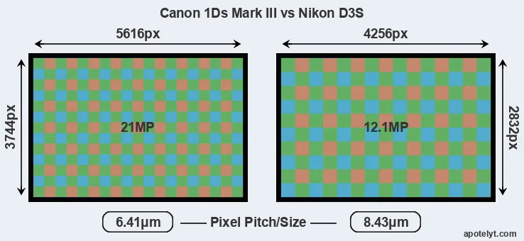 With 21MP, the 1Ds Mark III offers a higher resolution than the D3S (12.1MP), but the 1Ds Mark III has smaller individual pixels (pixel pitch of 6.41μm versus 8.43μm for the D3S). Moreover, the D3S is a much more recent model (by 2 years and 1 month) than the 1Ds Mark III, and its sensor will have benefitted from technological advances during this time that enhance the light gathering capacity of its pixels.