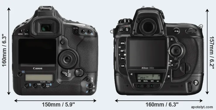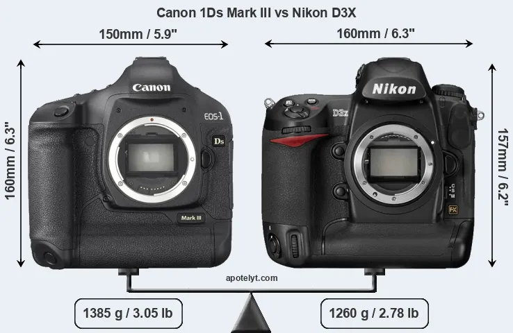 The physical size and weight of the Canon 1Ds Mark III and the Nikon D3X are illustrated in the side-by-side display below. The two cameras are presented according to their relative size. Three consecutive perspectives from the front, the top, and the back are available. All width, height and depth dimensions are rounded to the nearest millimeter.
