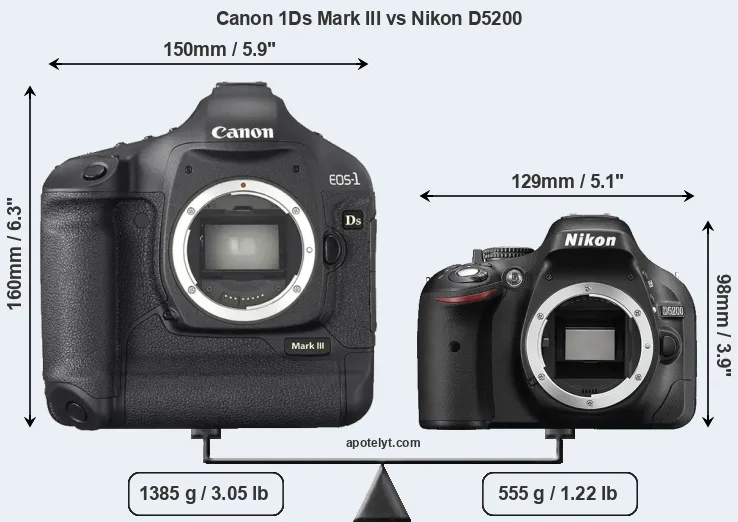 An illustration of the physical size and weight of the Canon 1Ds Mark III and the Nikon D5200 is provided in the side-by-side display below. The two cameras are presented according to their relative size. Three consecutive views from the front, the top, and the rear side are shown. All width, height and depth measures are rounded to the nearest millimeter.