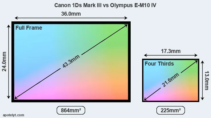 Of the two cameras under consideration, the Canon 1Ds Mark III features a full frame sensor and the Olympus E-M10 IV a Four Thirds sensor. The sensor area in the E-M10 IV is 74 percent smaller. As a result of these sensor size differences, the cameras have a format factor of, respectively, 1.0 and 2.0. The sensor in the 1Ds Mark III has a native 3:2 aspect ratio, while the one in the E-M10 IV offers a 4:3 aspect.