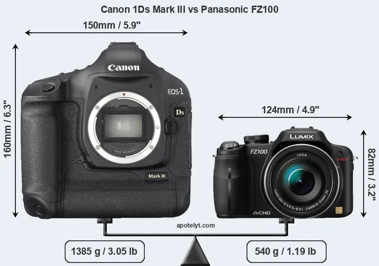 An illustration of the physical size and weight of the Canon 1Ds Mark III and the Panasonic FZ100 is provided in the side-by-side display below. The two cameras are presented according to their relative size. Three consecutive perspectives from the front, the top, and the back are available. All width, height and depth measures are rounded to the nearest millimeter.