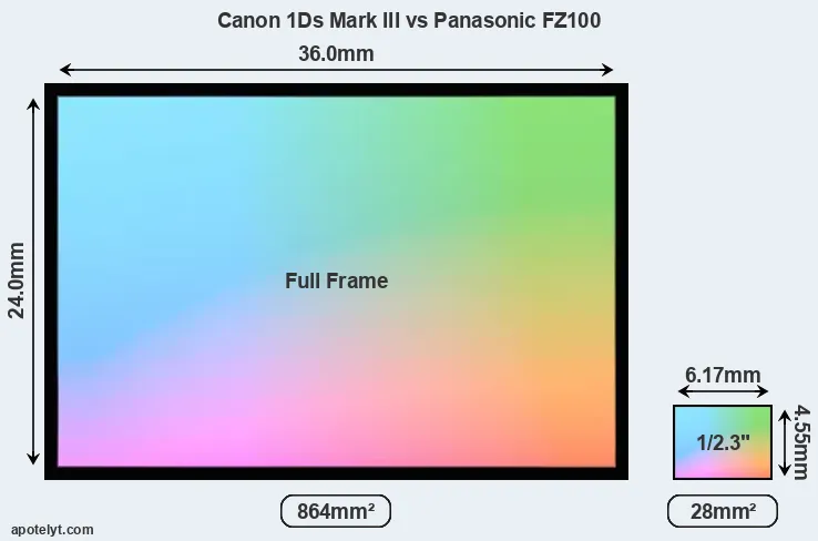 Of the two cameras under consideration, the Canon 1Ds Mark III features a full frame sensor and the Panasonic FZ100 a 1/2.3-inch sensor. The sensor area in the FZ100 is 97 percent smaller. As a result of these sensor size differences, the cameras have a format factor of, respectively, 1.0 and 5.6. The sensor in the 1Ds Mark III has a native 3:2 aspect ratio, while the one in the FZ100 offers a 4:3 aspect.