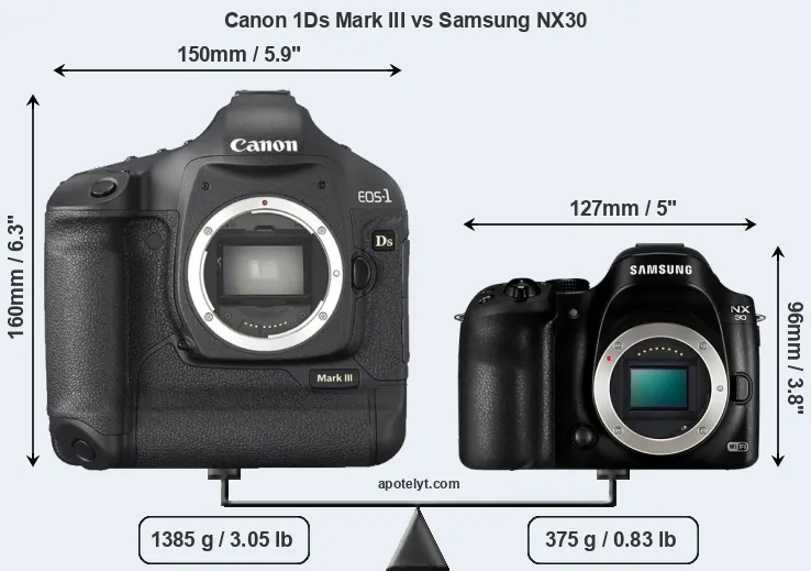 The side-by-side display below illustrates the physical size and weight of the Canon 1Ds Mark III and the Samsung NX30. The two cameras are presented according to their relative size. Three successive views from the front, the top, and the rear are shown. All size dimensions are rounded to the nearest millimeter.
