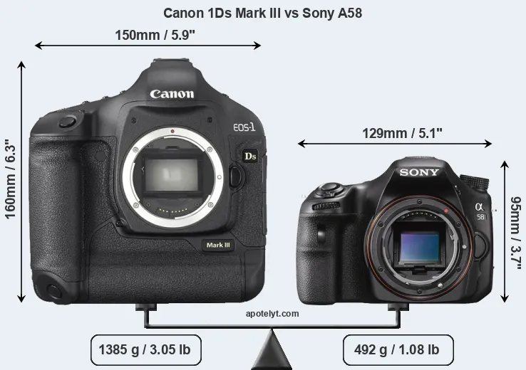 The physical size and weight of the Canon 1Ds Mark III and the Sony A58 are illustrated in the side-by-side display below. The two cameras are presented according to their relative size. Three consecutive perspectives from the front, the top, and the back are available. All width, height and depth dimensions are rounded to the nearest millimeter.