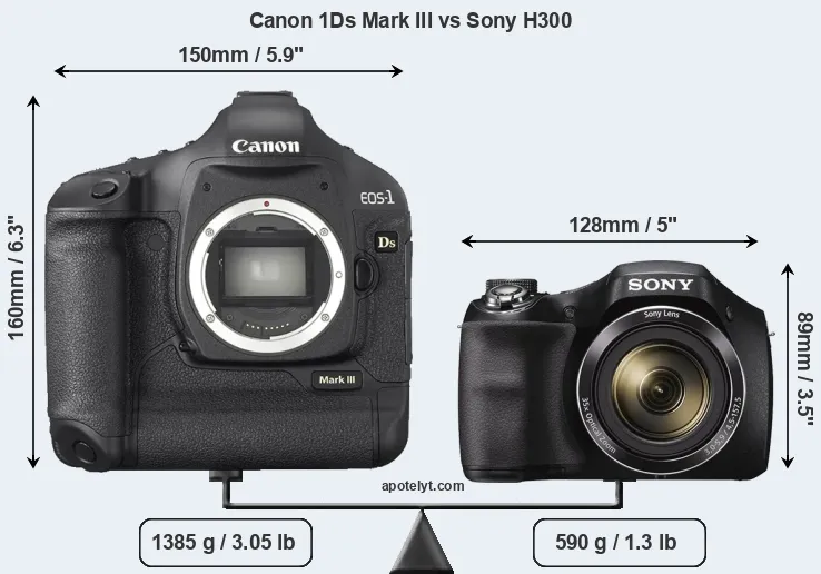 The side-by-side display below illustrates the physical size and weight of the Canon 1Ds Mark III and the Sony H300. The two cameras are presented according to their relative size. Three consecutive perspectives from the front, the top, and the back are available. All width, height and depth measures are rounded to the nearest millimeter.
