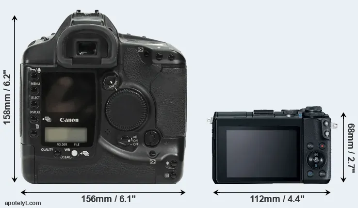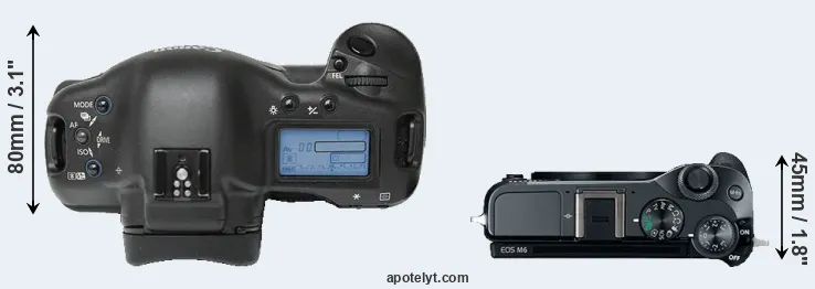The side-by-side display below illustrates the physical size and weight of the Canon 1Ds and the Canon M6. The two cameras are presented according to their relative size. Three successive views from the front, the top, and the rear are shown. All size dimensions are rounded to the nearest millimeter.