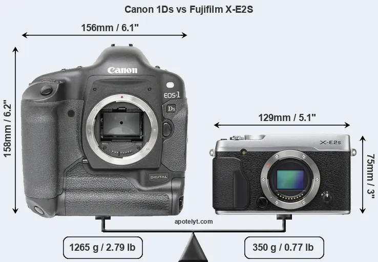 The physical size and weight of the Canon 1Ds and the Fujifilm X-E2S are illustrated in the side-by-side display below. The two cameras are presented according to their relative size. Three consecutive views from the front, the top, and the rear side are shown. All width, height and depth measures are rounded to the nearest millimeter.
