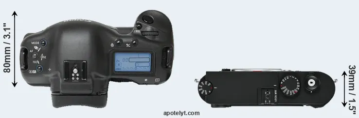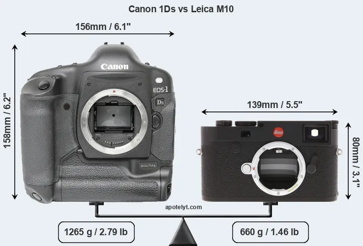 An illustration of the physical size and weight of the Canon 1Ds and the Leica M10 is provided in the side-by-side display below. The two cameras are presented according to their relative size. Three consecutive views from the front, the top, and the rear side are shown. All width, height and depth measures are rounded to the nearest millimeter.