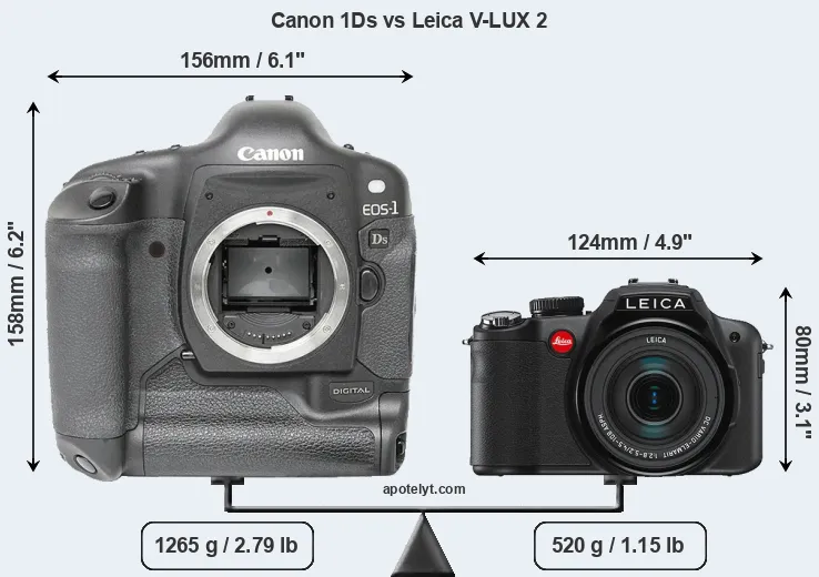 An illustration of the physical size and weight of the Canon 1Ds and the Leica V-LUX 2 is provided in the side-by-side display below. The two cameras are presented according to their relative size. Three consecutive perspectives from the front, the top, and the back are available. All size dimensions are rounded to the nearest millimeter.