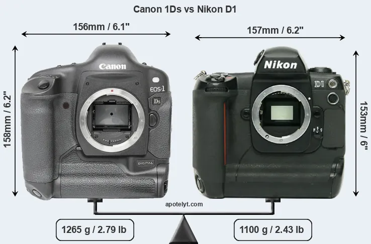 The physical size and weight of the Canon 1Ds and the Nikon D1 are illustrated in the side-by-side display below. The two cameras are presented according to their relative size. Three successive views from the front, the top, and the rear are shown. All width, height and depth measures are rounded to the nearest millimeter.