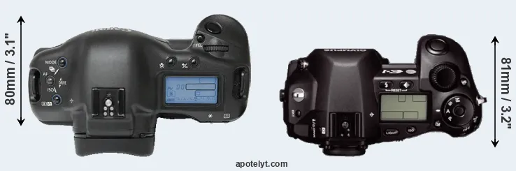 The physical size and weight of the Canon 1Ds and the Olympus E-1 are illustrated in the side-by-side display below. The two cameras are presented according to their relative size. Three consecutive perspectives from the front, the top, and the back are available. All width, height and depth measures are rounded to the nearest millimeter.