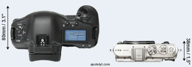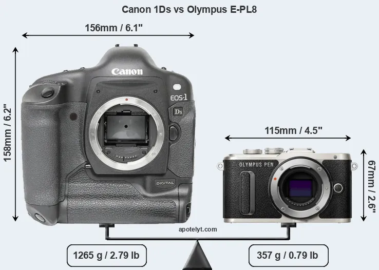 The side-by-side display below illustrates the physical size and weight of the Canon 1Ds and the Olympus E-PL8. The two cameras are presented according to their relative size. Three consecutive perspectives from the front, the top, and the back are available. All width, height and depth measures are rounded to the nearest millimeter.