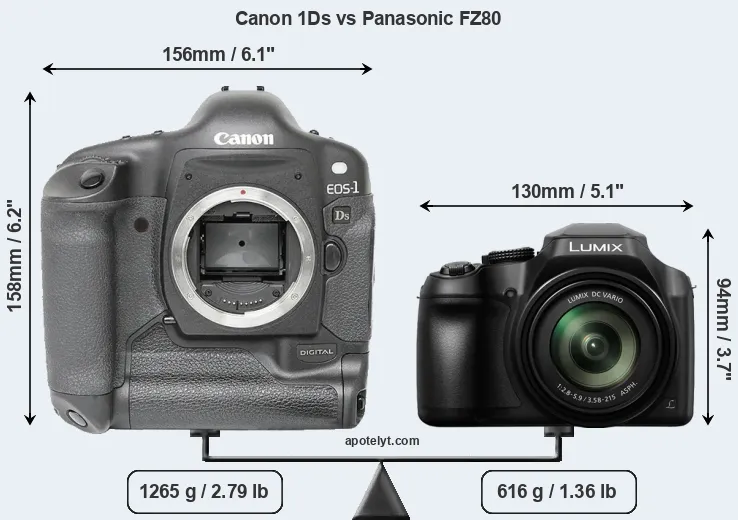 The physical size and weight of the Canon 1Ds and the Panasonic FZ80 are illustrated in the side-by-side display below. The two cameras are presented according to their relative size. Three consecutive views from the front, the top, and the rear side are shown. All width, height and depth measures are rounded to the nearest millimeter.