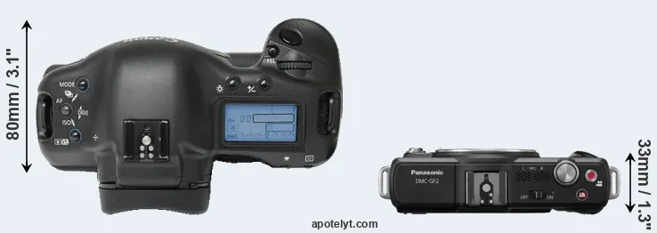 The side-by-side display below illustrates the physical size and weight of the Canon 1Ds and the Panasonic GF2. The two cameras are presented according to their relative size. Three consecutive perspectives from the front, the top, and the back are available. All size dimensions are rounded to the nearest millimeter.