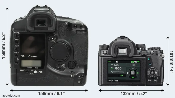 The physical size and weight of the Canon 1Ds and the Pentax KP are illustrated in the side-by-side display below. The two cameras are presented according to their relative size. Three successive views from the front, the top, and the rear are shown. All width, height and depth measures are rounded to the nearest millimeter.
