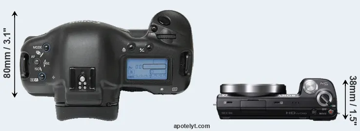 The side-by-side display below illustrates the physical size and weight of the Canon 1Ds and the Sony NEX-5N. The two cameras are presented according to their relative size. Three consecutive views from the front, the top, and the rear side are shown. All width, height and depth dimensions are rounded to the nearest millimeter.