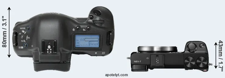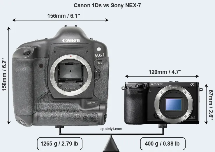 The side-by-side display below illustrates the physical size and weight of the Canon 1Ds and the Sony NEX-7. The two cameras are presented according to their relative size. Three consecutive views from the front, the top, and the rear side are shown. All width, height and depth dimensions are rounded to the nearest millimeter.