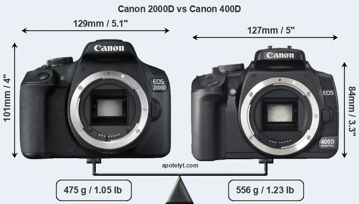 If the front view area (width x height) of the cameras is taken as an aggregate measure of their size, the Canon 400D is notably smaller (18 percent) than the Canon 2000D. However, the 400D is markedly heavier (17 percent) than the 2000D. In this context, it is worth noting that neither the 2000D nor the 400D are weather-sealed.