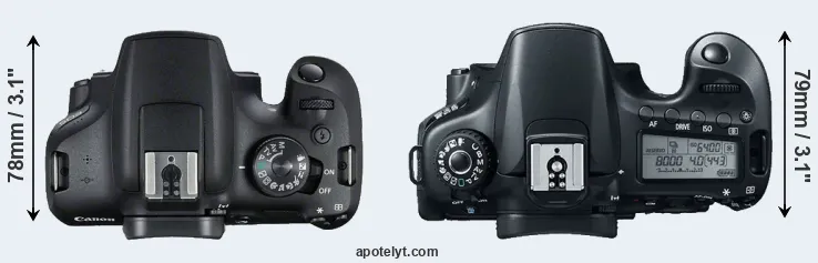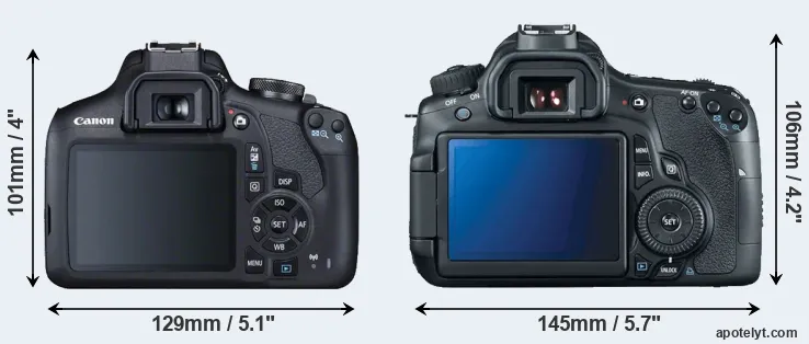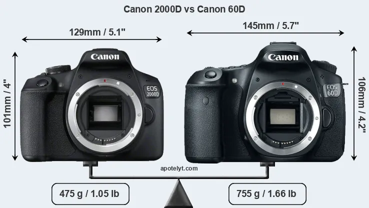 The side-by-side display below illustrates the physical size and weight of the Canon 2000D and the Canon 60D. The two cameras are presented according to their relative size. Three consecutive perspectives from the front, the top, and the back are available. All width, height and depth dimensions are rounded to the nearest millimeter.