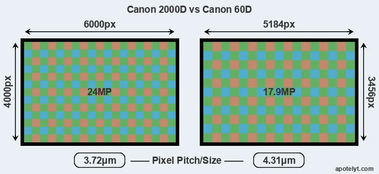 While the two cameras under review share the same sensor size, the 2000D offers a higher resolution of 24 megapixels, compared with 17.9 MP of the 60D. This megapixels advantage translates into a 16 percent gain in linear resolution. On the other hand, these sensor specs imply that the 2000D has a higher pixel density and a smaller size of the individual pixel (with a pixel pitch of 3.72μm versus 4.31μm for the 60D). In this context, it should be noted, however, that the 2000D is much more recent (by 7 years and 6 months) than the 60D, and its sensor will have benefitted from technological advances during this time that compensate for the smaller pixel size.