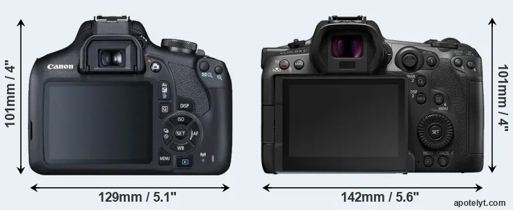 The side-by-side display below illustrates the physical size and weight of the Canon 2000D and the Canon R5 C. The two cameras are presented according to their relative size. Three successive views from the front, the top, and the rear are shown. All width, height and depth measures are rounded to the nearest millimeter.