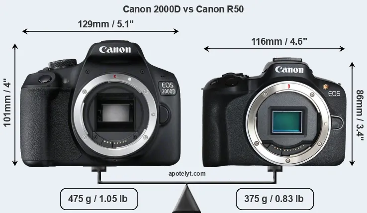 The physical size and weight of the Canon 2000D and the Canon R50 are illustrated in the side-by-side display below. The two cameras are presented according to their relative size. Three consecutive perspectives from the front, the top, and the back are available. All width, height and depth measures are rounded to the nearest millimeter.