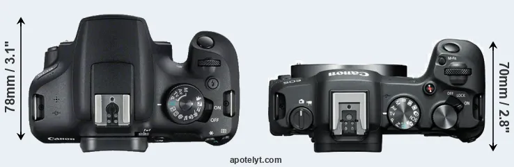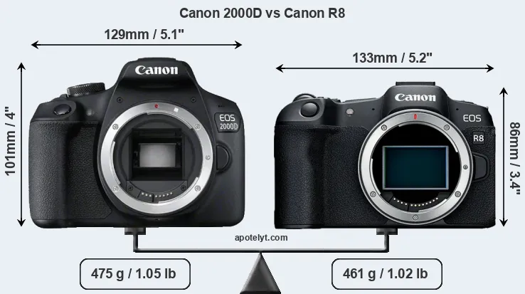The physical size and weight of the Canon 2000D and the Canon R8 are illustrated in the side-by-side display below. The two cameras are presented according to their relative size. Three consecutive perspectives from the front, the top, and the back are available. All width, height and depth measures are rounded to the nearest millimeter.