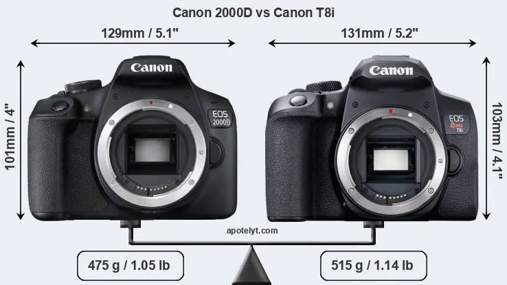 An illustration of the physical size and weight of the Canon 2000D and the Canon T8i is provided in the side-by-side display below. The two cameras are presented according to their relative size. Three consecutive views from the front, the top, and the rear side are shown. All width, height and depth measures are rounded to the nearest millimeter.