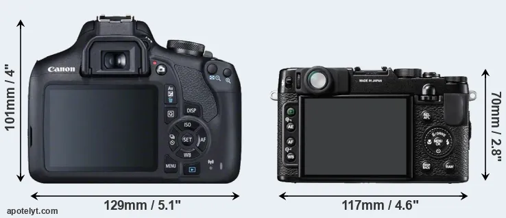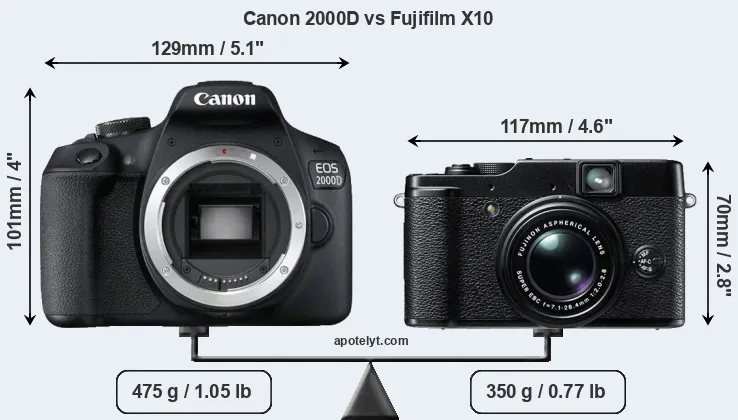 The side-by-side display below illustrates the physical size and weight of the Canon 2000D and the Fujifilm X10. The two cameras are presented according to their relative size. Three consecutive perspectives from the front, the top, and the back are available. All width, height and depth measures are rounded to the nearest millimeter.