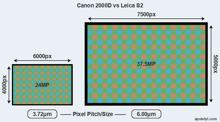 With 37.5MP, the S2 offers a higher resolution than the 2000D (24MP), but the S2 nevertheless has larger individual pixels (pixel pitch of 6.00μm versus 3.72μm for the 2000D) due to its larger sensor. However, the 2000D is a much more recent model (by 9 years and 5 months) than the S2, and its sensor will have benefitted from technological advances during this time that enhance the light gathering capacity of its pixel-units. Coming back to sensor resolution, it should be mentioned that the S2 has no anti-alias filter installed, so that it can capture all the detail its sensor resolves.