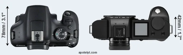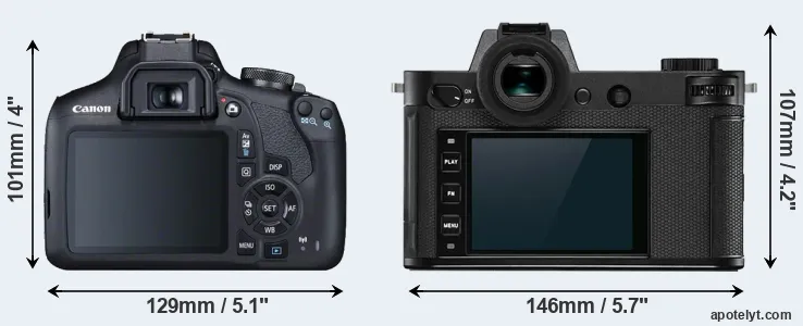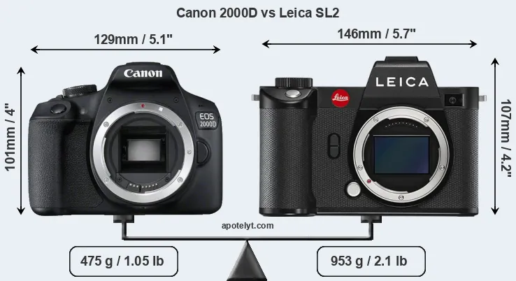 The physical size and weight of the Canon 2000D and the Leica SL2 are illustrated in the side-by-side display below. The two cameras are presented according to their relative size. Three consecutive perspectives from the front, the top, and the back are available. All width, height and depth dimensions are rounded to the nearest millimeter.