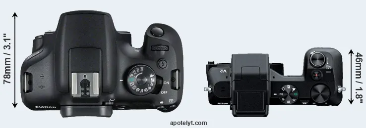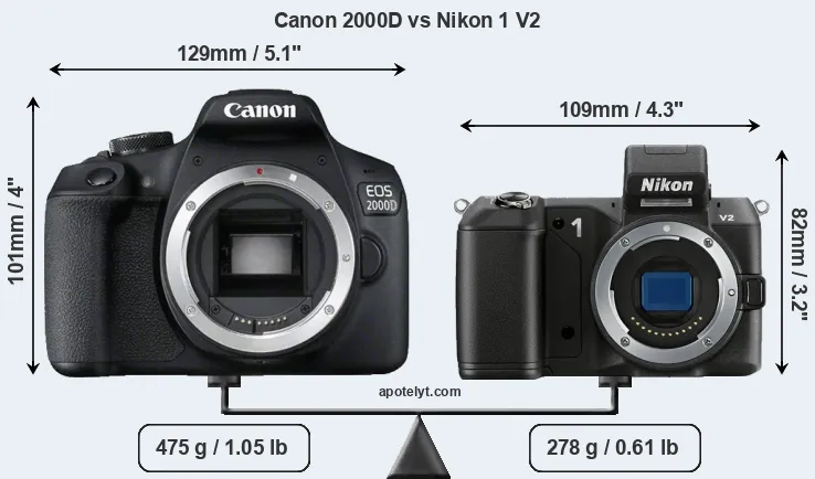 The side-by-side display below illustrates the physical size and weight of the Canon 2000D and the Nikon 1 V2. The two cameras are presented according to their relative size. Three consecutive perspectives from the front, the top, and the back are available. All width, height and depth measures are rounded to the nearest millimeter.