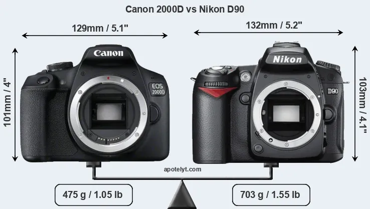 An illustration of the physical size and weight of the Canon 2000D and the Nikon D90 is provided in the side-by-side display below. The two cameras are presented according to their relative size. Three consecutive perspectives from the front, the top, and the back are available. All width, height and depth measures are rounded to the nearest millimeter.