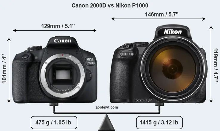 An illustration of the physical size and weight of the Canon 2000D and the Nikon P1000 is provided in the side-by-side display below. The two cameras are presented according to their relative size. Three successive views from the front, the top, and the rear are shown. All width, height and depth dimensions are rounded to the nearest millimeter.