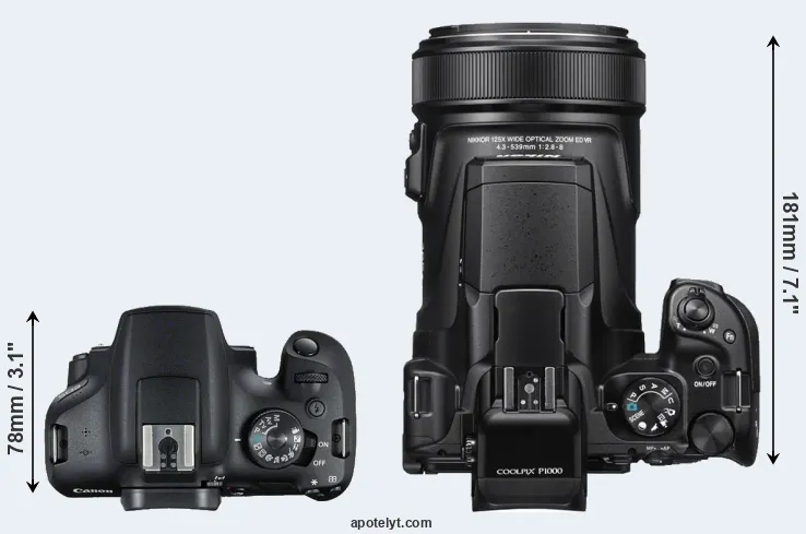 The above size and weight comparisons are to some extent incomplete and possibly misleading, as the P1000 has a lens built in, whereas the 2000D is an interchangeable lens camera that requires a separate lens. Attaching the latter will add extra weight and bulk to the setup. You can compare the optics available for the 2000D and their specifications in the Canon EF Lens Catalog.