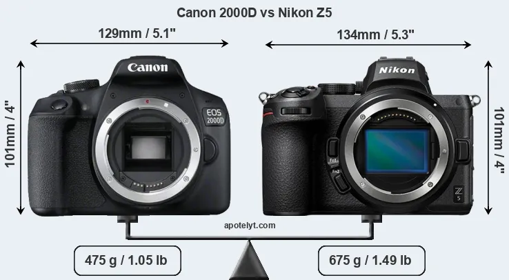 The physical size and weight of the Canon 2000D and the Nikon Z5 are illustrated in the side-by-side display below. The two cameras are presented according to their relative size. Three successive views from the front, the top, and the rear are shown. All width, height and depth measures are rounded to the nearest millimeter.