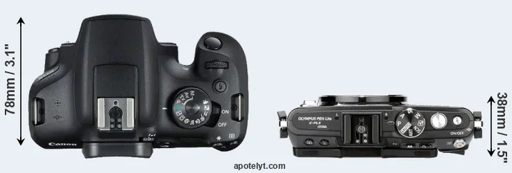 The physical size and weight of the Canon 2000D and the Olympus E-PL5 are illustrated in the side-by-side display below. The two cameras are presented according to their relative size. Three consecutive perspectives from the front, the top, and the back are available. All width, height and depth measures are rounded to the nearest millimeter.