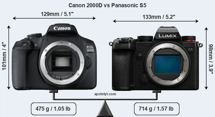 If the front view area (width x height) of the cameras is taken as an aggregate measure of their size, the Canon 2000D and the Panasonic S5 are of equal size. However, the S5 is substantially heavier (50 percent) than the 2000D. It is noteworthy in this context that the S5 is splash and dust-proof, while the 2000D does not feature any corresponding weather-sealing.