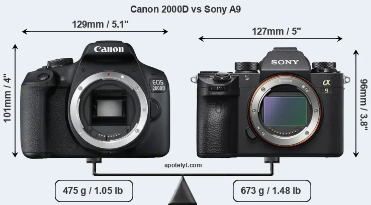 The side-by-side display below illustrates the physical size and weight of the Canon 2000D and the Sony A9. The two cameras are presented according to their relative size. Three consecutive perspectives from the front, the top, and the back are available. All width, height and depth measures are rounded to the nearest millimeter.