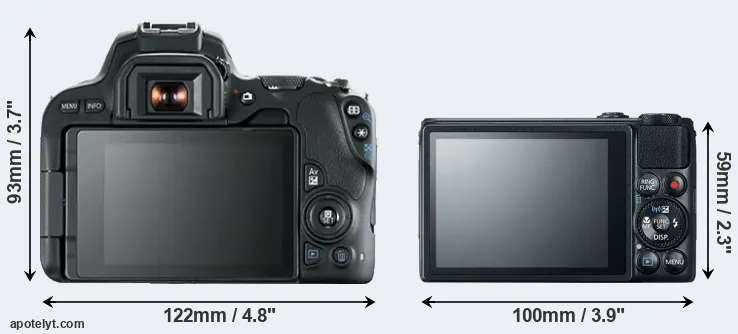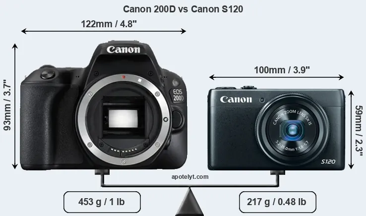 The side-by-side display below illustrates the physical size and weight of the Canon 200D and the Canon S120. The two cameras are presented according to their relative size. Three successive views from the front, the top, and the rear are shown. All width, height and depth dimensions are rounded to the nearest millimeter.